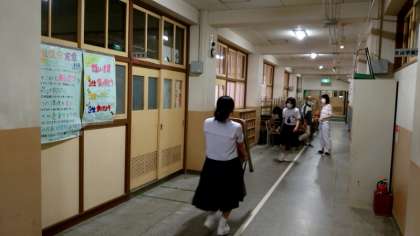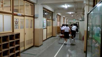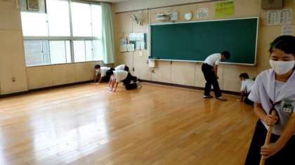 本日の授業も無事終了しホッと一息したいところですが、今日は学期に1度の「ワックス掛け」の日。教室の床をワックス掛けし美しく磨きます。1年生にとっては初めての取り組みです。みんなで協力して机やイスを外へ運びましょう。