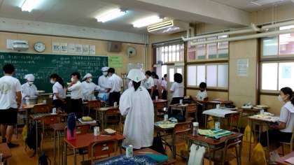 4限の授業が終わり、楽しみな昼休みの始まりです。今日の給食は「チキンカレー・フルーツ白玉」。皆さん大好きなメニューです。1年3組では給食当番さんがクラスメイトに配食中。いっぱい食べて午後からも頑張りましょう!
