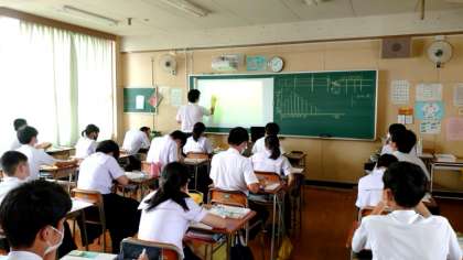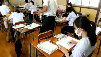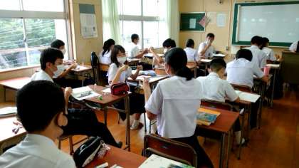 3年生理科で「物体の運動」を学習中。1秒間で60回打点される記録タイマーを使って「運動の距離と時間」を測ります。記録(打点)テープを切り取りながら、距離(cm)や速さを求めます。皆さん互いに記録テープを確かめながら課題に取り組んでいました。
