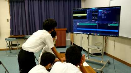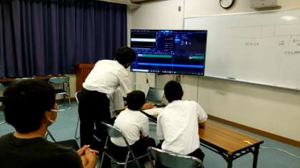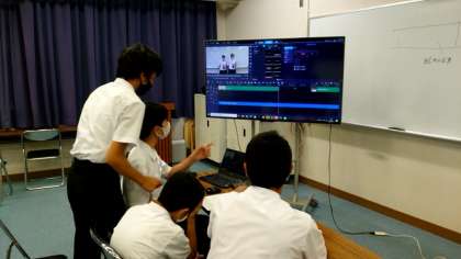 2年生男子の皆さんがパソコンで動画を編集中。学年で取り組んでいる「防災学習」に関する作業とのこと。詳しい中身はまだ内緒だそうですが、2学期には皆さんにお知らせできるそうです。どんな作品になるか楽しみです。