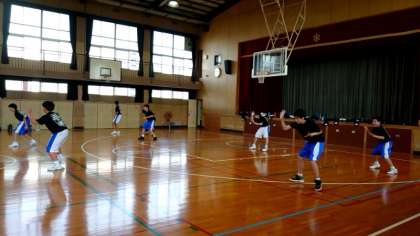 体育館から元気な声が届いてきました。男子バスケットボール部の皆さんが練習に取り組んでいます。ボールを持っているときやディフェンス時の基本姿勢を教わっています。基本姿勢を維持したまま、コートを素早く動き回るのはキツイいでしょう。繰り返し練習し、スキルアップをめざしてください!