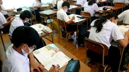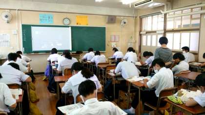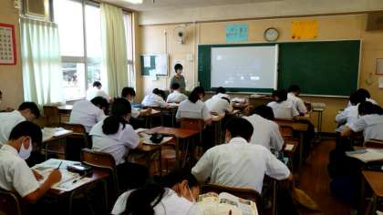 2年生社会科で瀬戸内地方の農業を学習中。年間を通して雨(降水量)が少なく温暖な気候のため、瀬戸内ではミカンなどのかんきつ類の栽培がさかんです。皆さん、プリントに要点を書き込みながら学習に取り組んでいました。