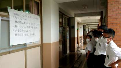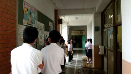 現在1年生が耳鼻科検診を受診中。クラスごとに保健室前に集合し、1人ずつお医者さまに診ていただきます。順番を待つ態度も良く、スムーズに診察が進んでいる模様。高津中生らしい行動ができており感心ですね。