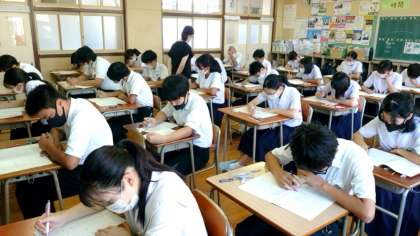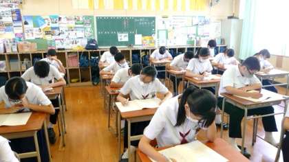 課題テストで「英語のリスニング」が行われます。3年生になると問題の質・量ともにレベルアップしています。皆さん耳をすませて英文の聴き取りに集中しています。スピーカーから次々に問題が流れるので熟考する時間が欲しいですね。