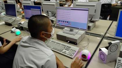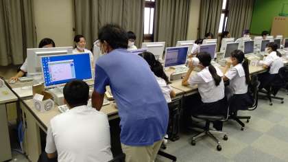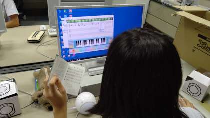 2年生の技術の授業ではパソコン教室で「プログラミング学習」を学びました。自分で考えて自分オリジナルの作品を作っていましたね。生徒手帳を広げて高津中の校歌の譜面を見ながら、校歌のメロディーを作って取り込んでいる人もいましたね。