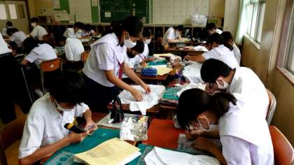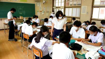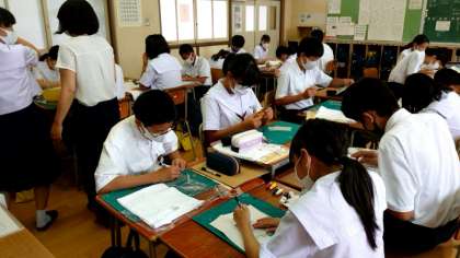 1年生家庭科のTシャツ制作が進んでいます。各自が考えたデザインを薄いプラ板に描き、カッターやハサミで型を作ります。パンダやウサギなどの動物や果物のイラストも多いですね。素敵なTシャツができると良いですね。