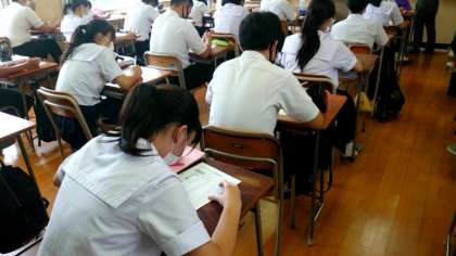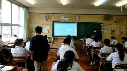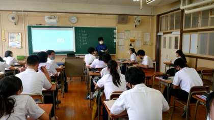 3年生英語の授業が行われています。ウォーミングアップとして海の生き物を英語でどう呼ぶかを学習中。サメ(shark)やイルカ(dolphin)はおなじみですが、クラゲ(jellyfish)、タツノオトシゴ(seahorse)は、面白い表現ですね。
