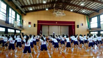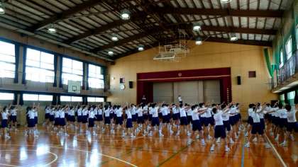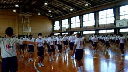 (上から)体育館でラジオ体操の練習です
