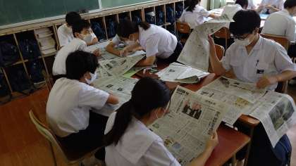 2年生 みんなで力をあわせ新聞を用いて文章を完成させています