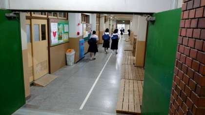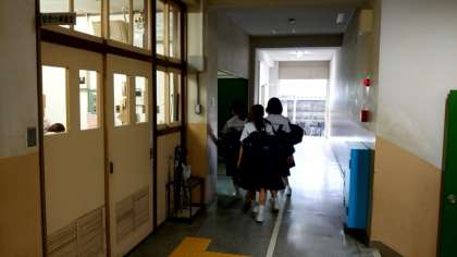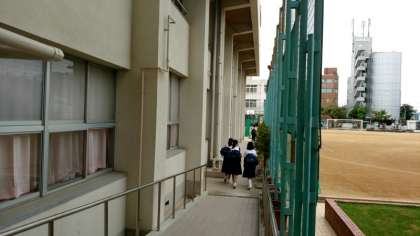 厚い雲が空を覆う朝。蒸し暑さを感じる中、皆さん登校してきました。混雑緩和のため、入室までのルート(動線)が異なります。1年は運動場側のスロープを、2年は西階段、3年は中央階段を利用しています。雨天時などは廊下がビショビショにならず良いかも…。