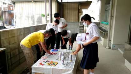 美術室外の作業場でスプレーします