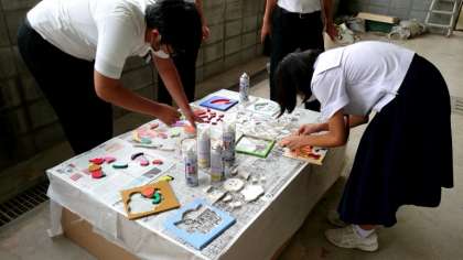 3年生美術科で制作している「木彫パズル」。パーツの塗装(色塗り)が終わり、多用途スプレーで仕上げの作業に取り組みます。動物やアニメキャラクターなどデザインはさまざま。色を塗ると華やかさが増しますね。