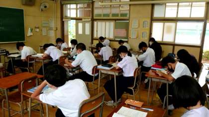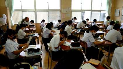 1年生の皆さんが「一次方程式」の計算問題を解いています。明日から始まる中間テスト。数学は明日2時間目にテストがあります。皆さん本番さながら問題を解き進めています。わからないことはぜひ先生に質問し、対策を講じましょう。