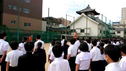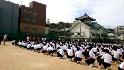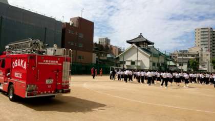各教室から運動場へと、皆さんスムーズに避難しています。今日は天王寺消防署員の方々に来ていただき、お話をうかがいました。地震など、いつ起こるかわからない災害に対して、どう自分の身を守るのか、意識する姿勢が大切ですね。