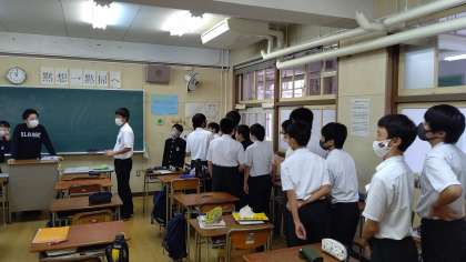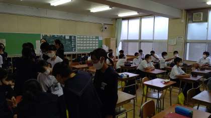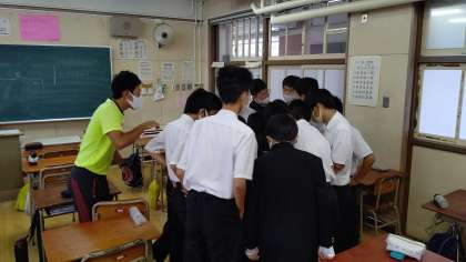 1年生は体育大会学年練習前に各学級で学年種目「台風の目」の作戦タイムを行いました。各学級、並び順など試行錯誤、皆さんでアイデアを出し合っていましたね。どんな競技が行われるか楽しみです。どの学級も力を出し切ってくださいね。