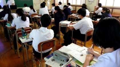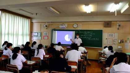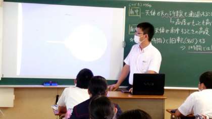 3年生理科で「天体」を学習中。今日は地球の自転による天体の見かけの動き=日周運動について教わります。先生がパソコンを駆使して太陽や地球の動きを説明します。画像を見ると内容がよくわかりますね。