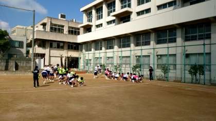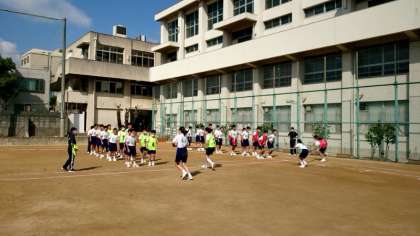 1年生の皆さんが体育大会の学年競技「台風の目」の練習中。長い竹の棒をバトンにして全員リレーで競います。カラーコーンの周囲を廻る際には遠心力が効いて上手く回れません。知恵と工夫が必要なようですね。