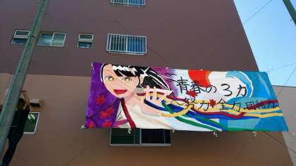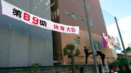 体育科の先生方と管理作業員さんが体育大会の垂れ幕をかけてくださっています。今年も美術部の皆さんが大作を描いてくれました。背景のグラデーションが美しいですね。明日の大会にむけて雰囲気が高まります。