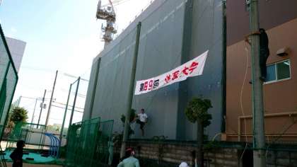 (上から)大きな垂れ幕をネットに結びます