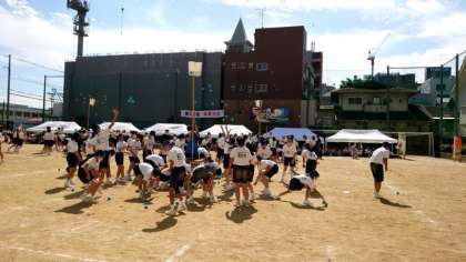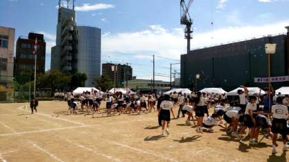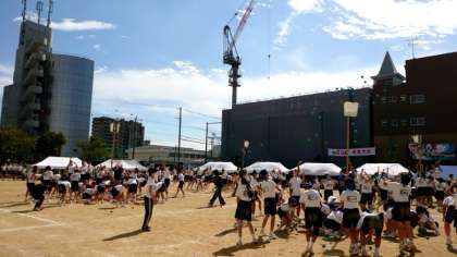 皆さん懸命にお手玉を投げ入れますが、なかなか上手く入りません。秋の青空に飛び交うカラフルなお手玉がキレイですね。