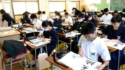 (上から)1年生書道の授業のようすです