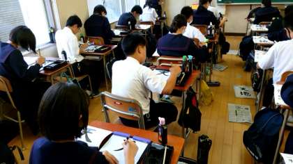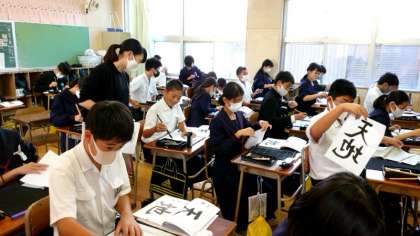 1年生で書道の授業が行われています。ピンと張りつめた空気が教室内に漂います。今日のお題は「天地」。とめ、はらいを意識しながら一筆ずつ気持ちを込めて書きあげます。作品は11月2日(月)の文化祭で発表するそうですよ。