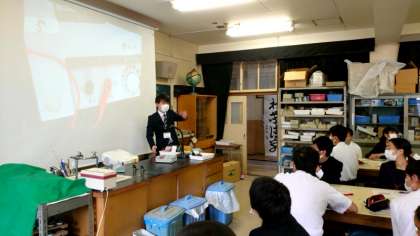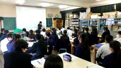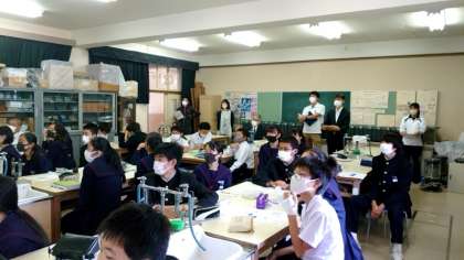 本日は、教育実習に来られた3名の先生の研究授業の日。トップバッターは理科の授業。実験の手順や方法をわかりやすく説明されます。各テーブルをくり返し廻って、アドバイスしてくださいました。