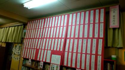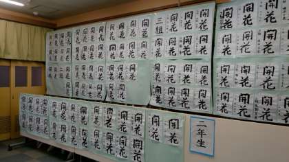 国語科では書写作品が展示されています。1年生が「天地」、2年生が「開花」3年生は自作の俳句がならびます。皆さん上手ですね。