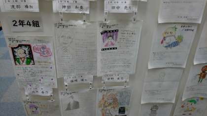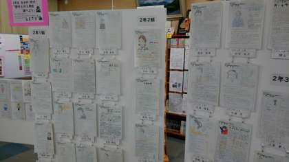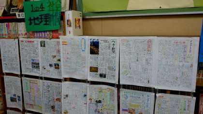 社会科では世界の国調べ(1年生)、歴史上の人物の調べ学習(2年生)が飾られています。写真やイラストを用いながらわかりやすくまとめられていますね。
