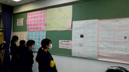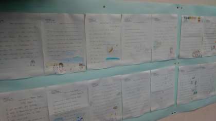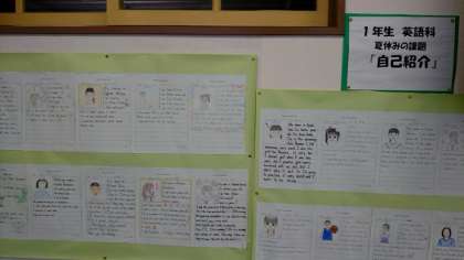 AL(アクティブ・ラーニング)教室では英語科の作品を展示中。1年生は自己紹介、2年生は夏休みの日記、3年生は家族や友達へのお手紙を、それぞれ英語で綴ります。学年ごとに英文の表現が変化しており興味深いですね。