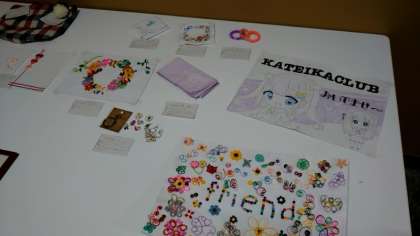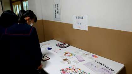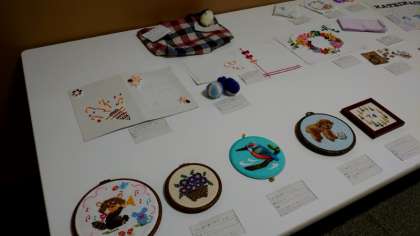 被服室前ろうかには家庭科部の作品を展示中。美しい刺繍がほどこされた作品やバッグなどの手芸作品が飾られています。きめ細やかで大変な作業の様子がうかがえる作品ばかりです。