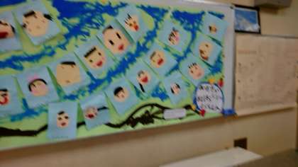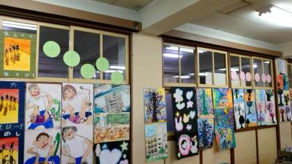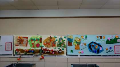 調理室には校区幼稚園・小学校の作品が飾られています。幼・小・中連携の一環として毎年作品を展示しています。小さい子たちの作品に思わず笑みがこぼれます。