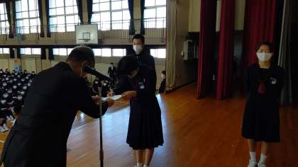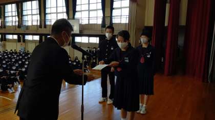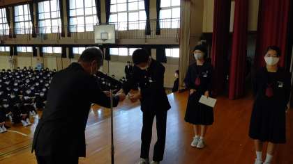全校集会の中で後期生徒会常任委員会の認証式がありました。前期の常任委員の皆さんのバトンが引き継がれましたね。学級、学年、そして学校へと大きな力を発揮していってくださいね。
