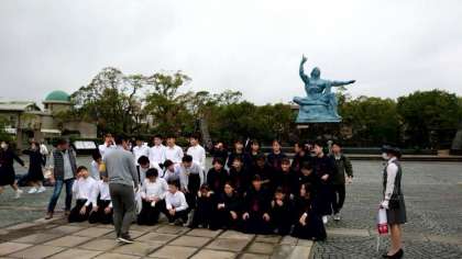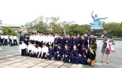 平和祈念像の前でクラス写真です。