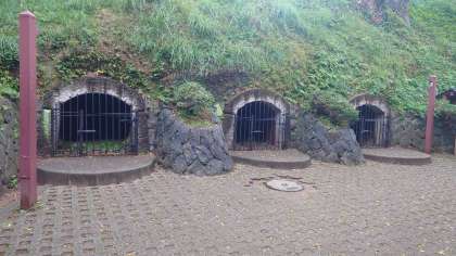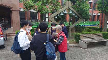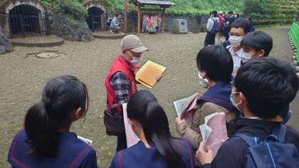 山里小学校の防空壕跡で、話を聞いてメモを取ります。