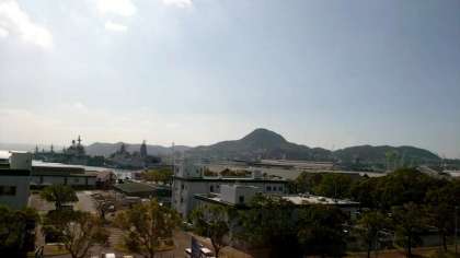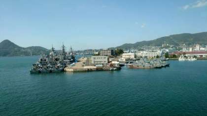 バスは佐世保港を通過中です。