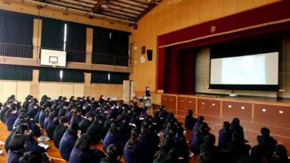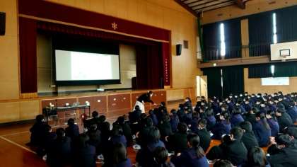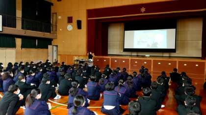 1年生の皆さんが体育館に集まり、ゲストティーチャー(助産師さん)のお話を聴いています。今日のテーマは「命の尊さ」について。生命の誕生に関しても触れていただけるのでしょうか。しっかりとお話をうかがってくださいね。