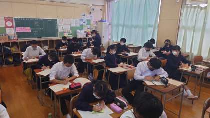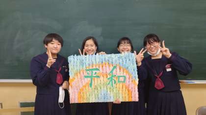 修学旅行で太刀洗平和祈念館を訪れました。平和の大切さを再認識し、学校に戻り、その時に感じたことを、自分たちの鶴にメッセージを書き込みました。一人ひとりの思いの詰まった鶴を学年有志が、ひとつの作品にまとめてくれました。この鶴を太刀洗で取り組まれている「千羽鶴平和プロジェクト」に届け、平和の取り組みのまとめになりました。