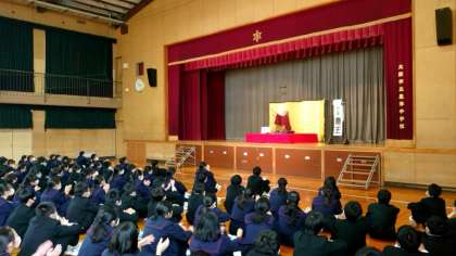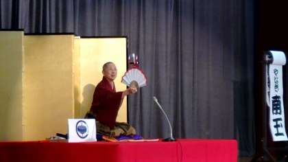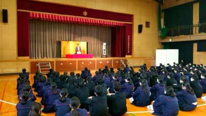 江戸(東京)の古典落語に加え、江戸独楽(こま)の曲芸も披露してくださいました。大きな独楽を自在に操るようすに皆さんびっくりしていました。