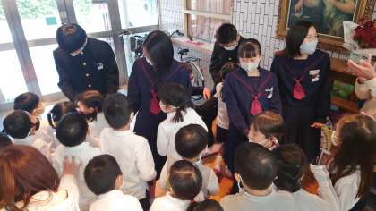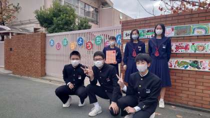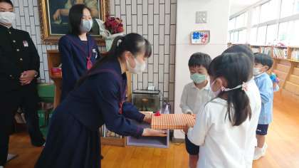 前期生徒会役員が校区幼稚園(2園)を訪問し、絵本をプレゼントしました。生徒会活動の一環として回収してきたエコキャップ活動の資金で絵本を購入し、園児の皆さんにお渡ししました。みなさんで楽しく読んでくださいね。