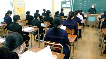 まもなく1時間目「国語」のテストが始まります。監督の先生から問題用紙が配られます。問題配付中は私語厳禁。皆さん静かに始まりのチャイムを待っています。
