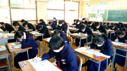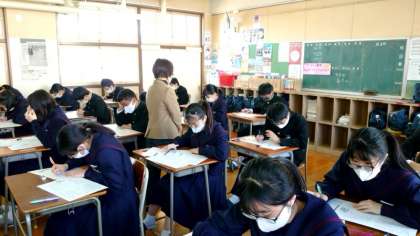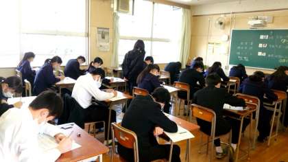 3時間目は「保健体育」のテストです。3年生では「ラジオ体操」に関する問題が出ている模様。皆さん頭の中で動きを思い出しながら解いていました。本来ならば東京オリンピックに関する出題があったかもしれませんね。