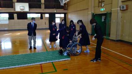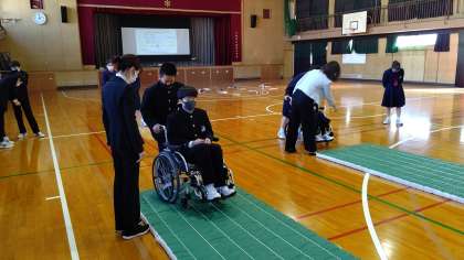 段差がある所を車いすで上手に進む方法を学んでいます