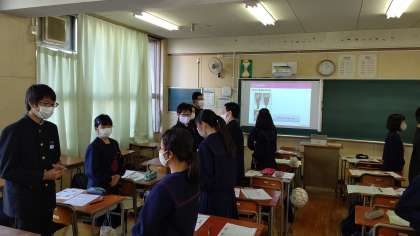 ホテリエの方から、立ち・振る舞いの大切さを教えていただきました。実際に、姿勢よく立てているかどうかお互いに向かい合って確かめ合う体験学習も行いました。美しく立てましたか?