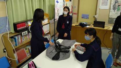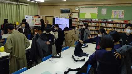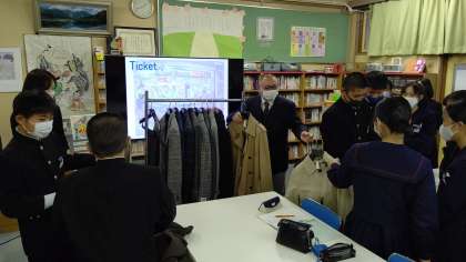 服の製造について教えていただきました。また、実際に様々な衣料を試着し学習することができました。