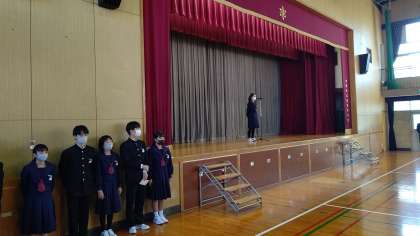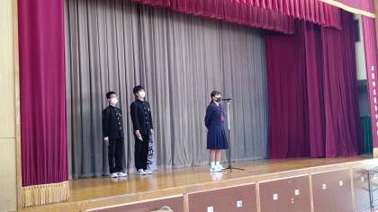 寒い中ですが皆さん元気に1週間がスタートしました。全校集会では校長先生より「人権週間」のお話がありました。いじめについては、学校生活を送る皆さんにとって大切に考えてほしい人権問題です。相手の事を思いながら、お互いあたたかい雰囲気で学校生活が送られるといいですね。生徒会役員さんからは、先日配付された生徒会新聞のクイズの答えが発表されました。皆さんを楽しませようとする企画やアイデアがうれしかったですね。発表後、皆さんからあたたかい拍手があり、校長先生のお話の内容にもつながる、気持ちのいい1週間のスタートとなりました。