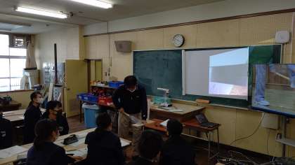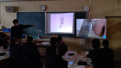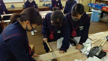 2時間目、1年3組の技術の授業で両刃のこぎりを使った木材の切断の方法を学びました。刃のつくりから学んで、木材の木目にあわせた刃を用いて切断します。皆さん上手に切れましたか?各机ごとに友達と協力しながら切断し、助け合っていましたね。1枚の木材からそれぞれが、これからCDラック、収納ケースなどを作成していきます。出来上がりが楽しみですね。