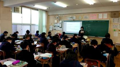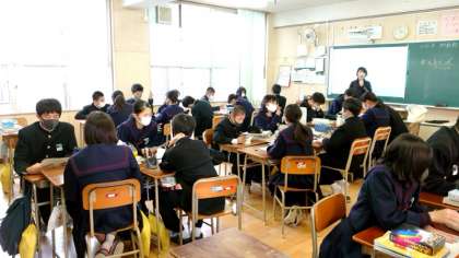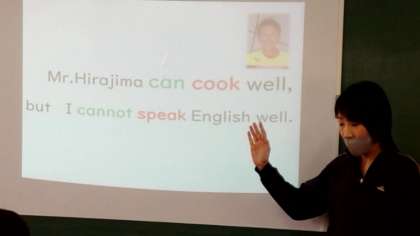 1年生英語科で「can(助動詞)」を使った英文を学習中。例文「〇〇さんは〇〇することができます」にクラスメイトの名前を入れて文章を作成します。お友達の良いところ(できるところ)を見つけることができましたか?