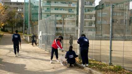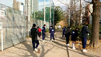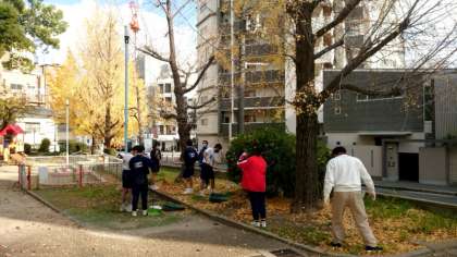 各公園ともに落ち葉がいっぱい。皆さん熊手やホウキを使ってイチョウや桜など、色とりどりの葉を集めています。