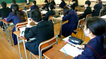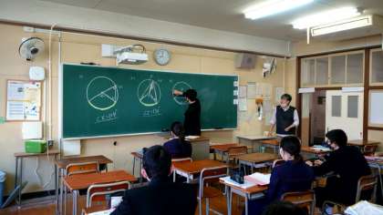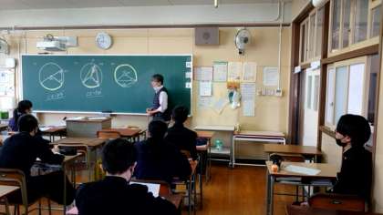 3年生数学科で円周角の問題に取り組んでいます。二等辺三角形などさまざまな図形の知識を使って解いていきます。入試でもよく出題されるので、解法をしっかりおさえておきましょう。